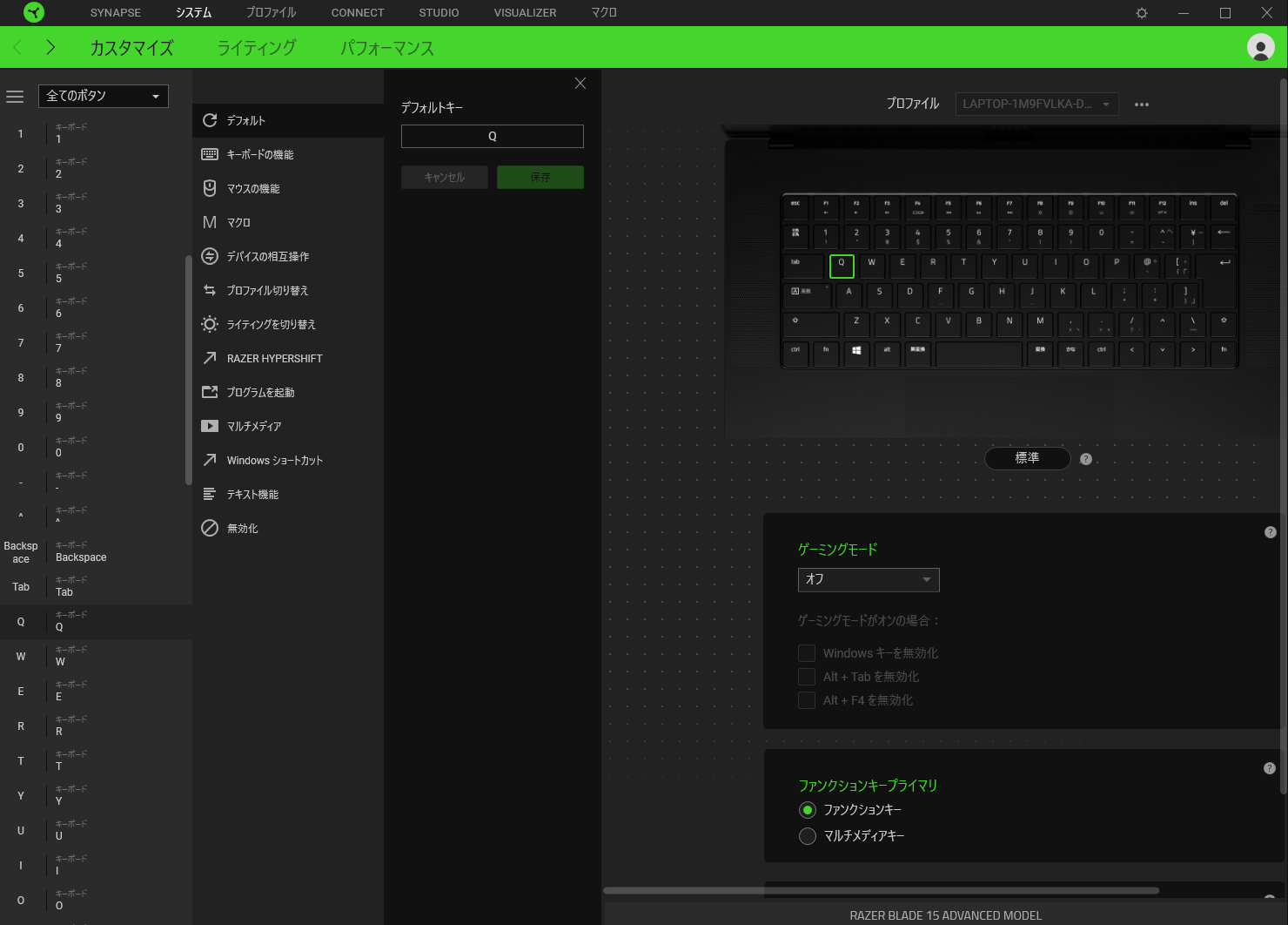 カスタム画面ではキーに色々割り当てられる