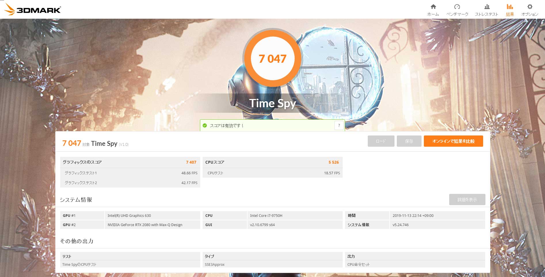 SCORE: 15158 / 平均フレームレート: 125.6 / 最低フレームレート: 47 / 評価: 非常に快適