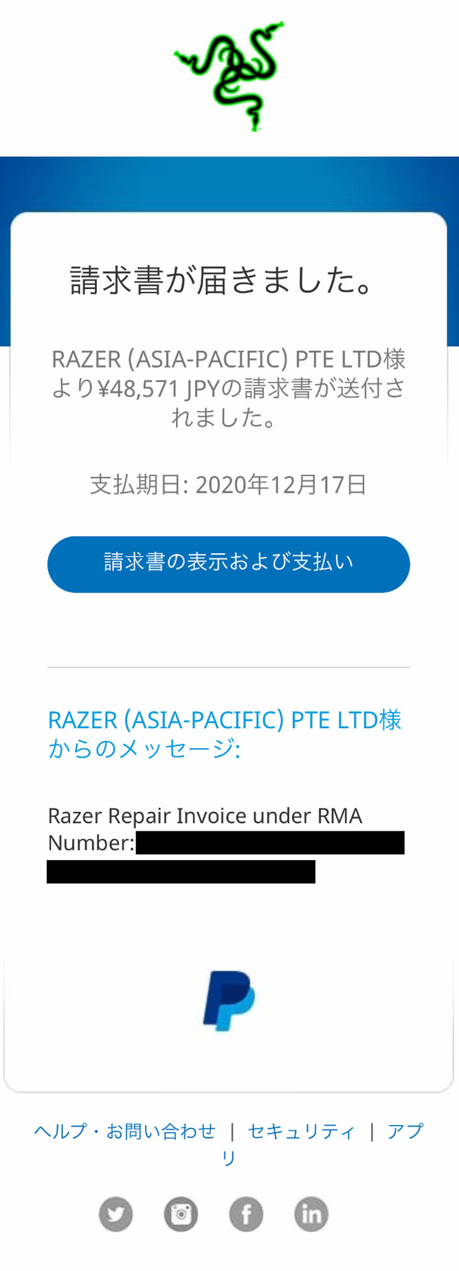 | こんにちは、 あなたが素晴らしい⼀⽇を過ごしていることを願っています。 私はRazerサポートチームのJamesの⼀員です。 ご回答ありがとうございます。RazerBladeは、購⼊⽇に基づく保証の対象ではなくなったようです。 この修理には料⾦がかかりますが、検査のために最初にデバイスを送付する必要があるため、現在、提供する番号はありません。 サービスセンターが体系的にデバイスを受け取ると、関連部⾨からケースの更新が提供され、修理費⽤の⾒積もりが送信されます。 修理をご希望の場合は、以下の情報をご記⼊ください。できるだけ早く修理を⼿配いたします。 名前︓ 電⼦メールアドレス︓ 電話番号︓ 住所︓ 市︓ 州/県︓ 郵便番号︓ 国︓ 参考までに、このメールのケース番号は xxxxxx-xxxxxx です。 お返事を楽しみにしています。 ではごきげんよう、 Razerサポートチーム |