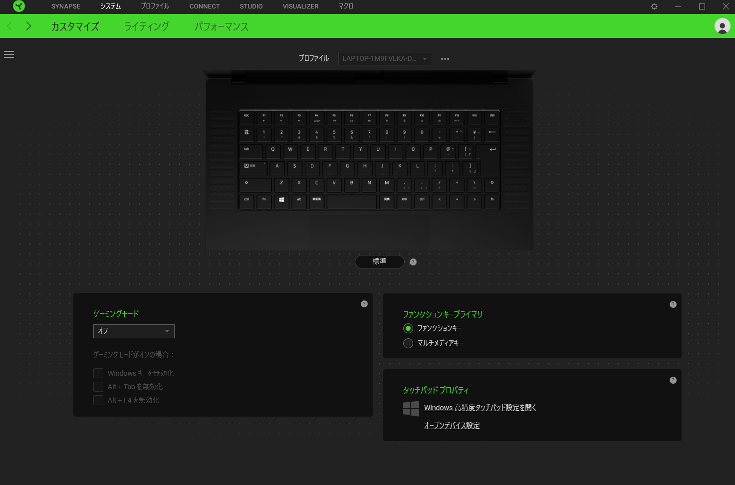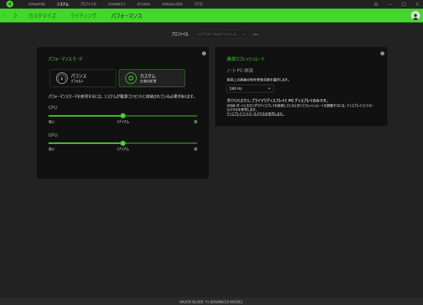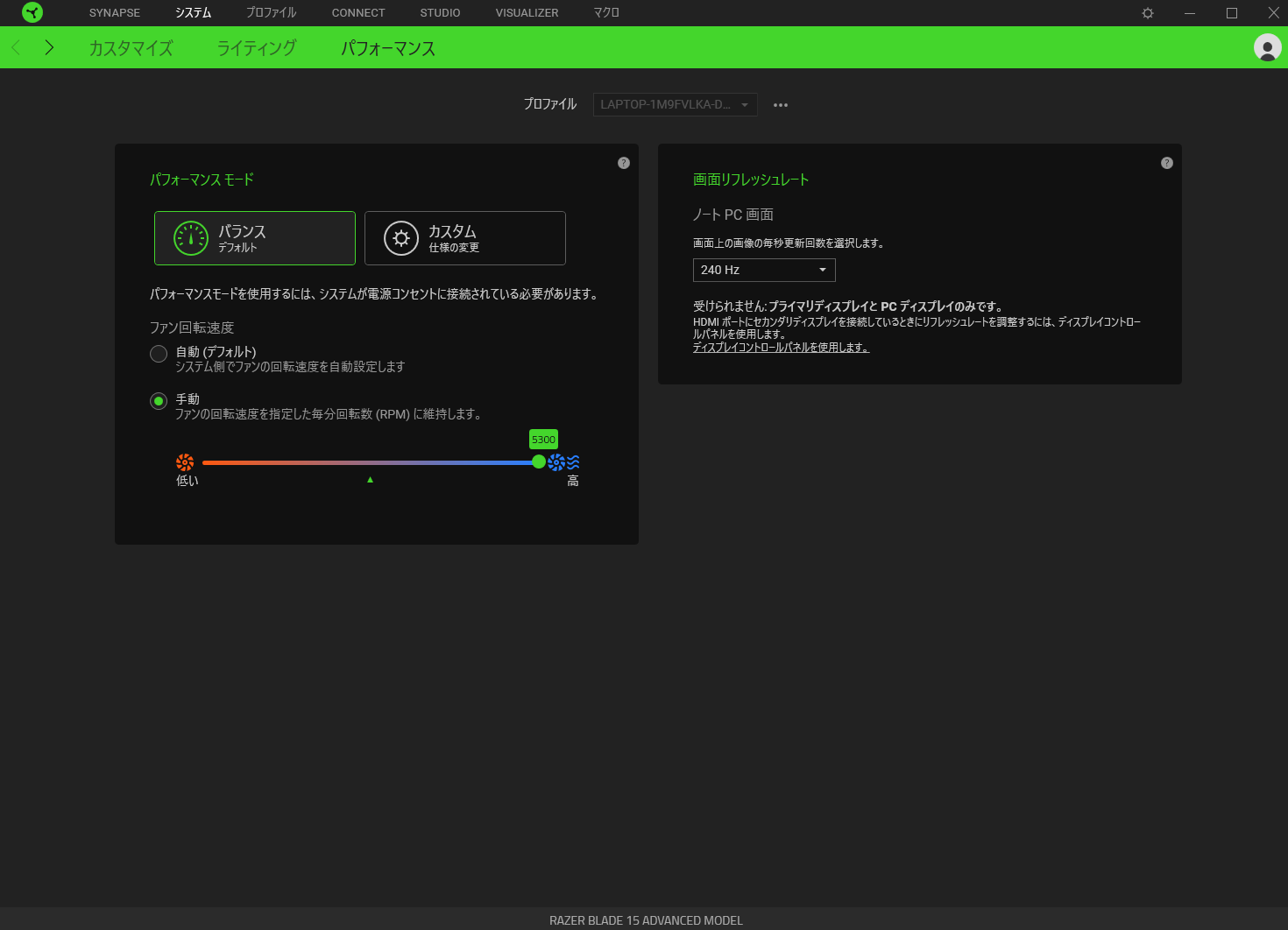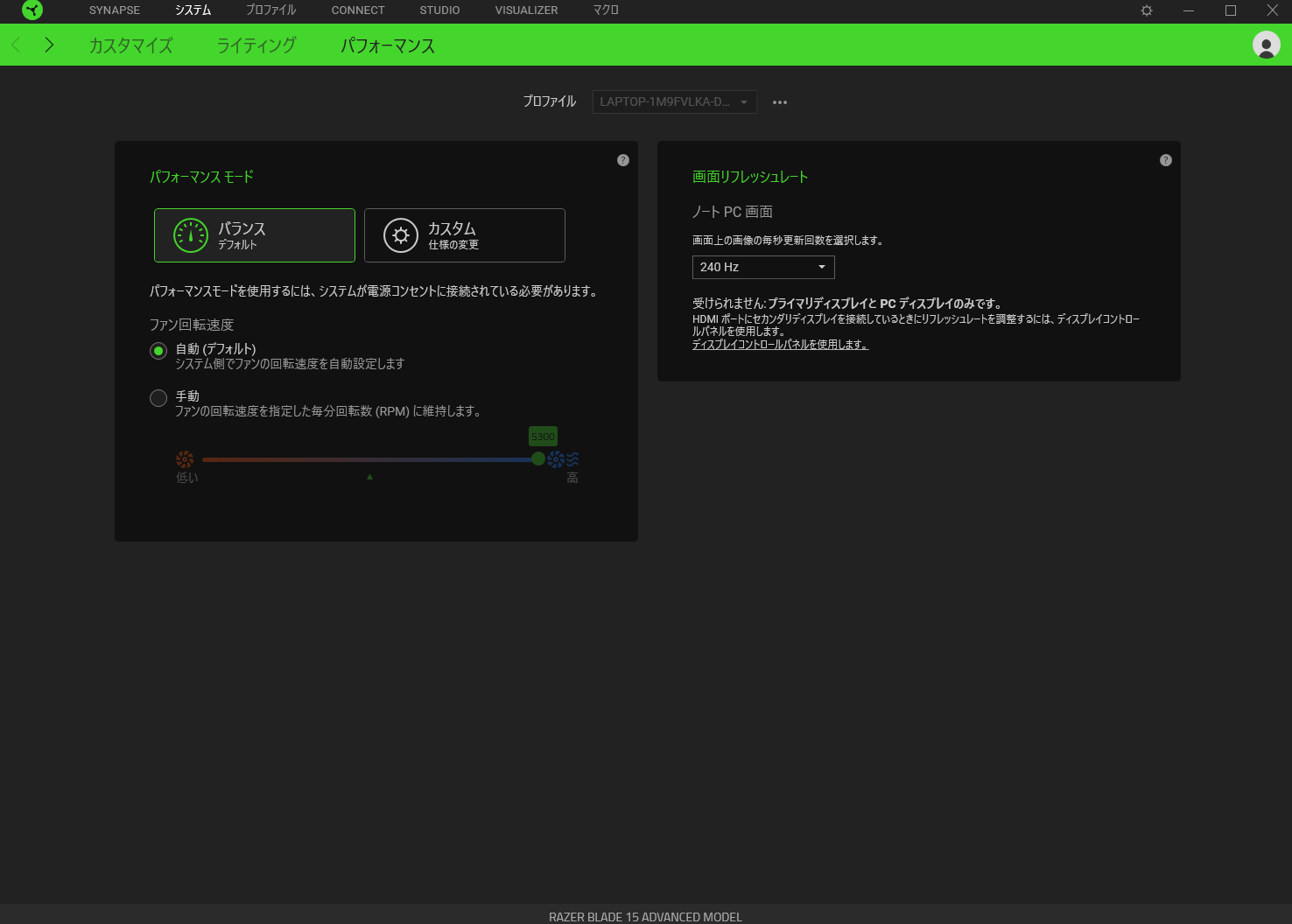 ファンの回転数や画面のリフレッシュレートやCPU/GPUのパフォーマンスを設定できます。