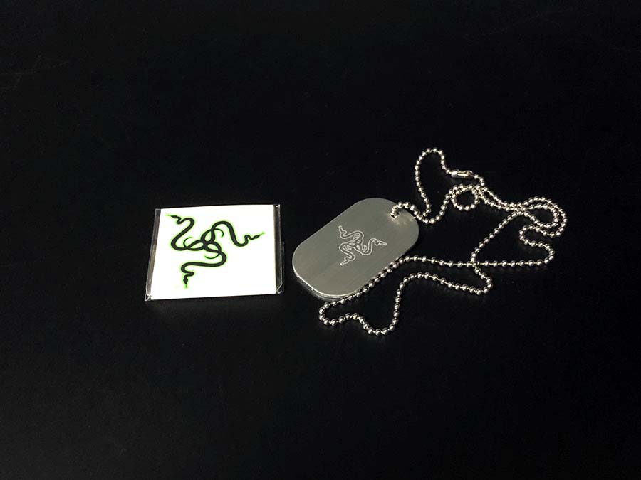 まずは、RazerロゴのドッグタグとRazerロゴの小さいステッカーが10枚ありました。