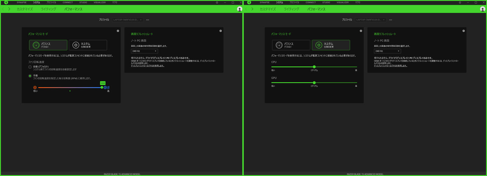 また、Razer BLADEのソフトウェア設定(Synapse3)のパフォーマンスモードのカスタム設定バランスモード(デフォルト)は、温度、パフォーマンスにどのような変化があるのか検証してみようと思います。