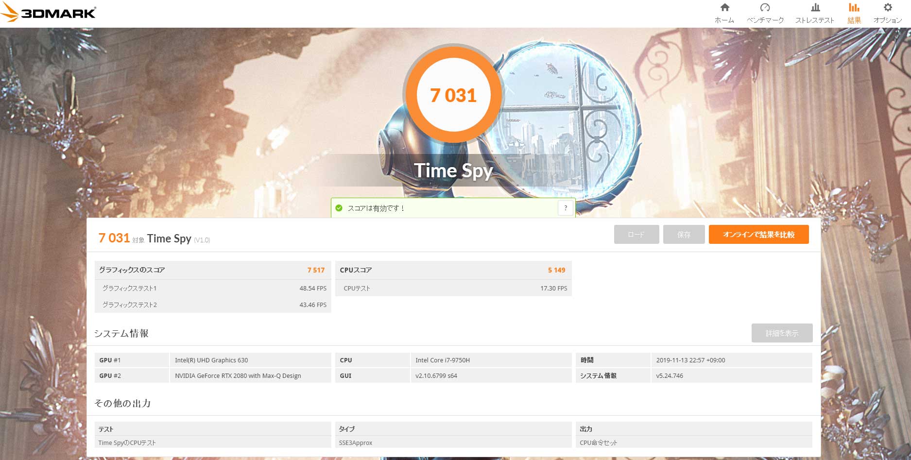 SCORE: 15789 / 平均フレームレート: 131 / 最低フレームレート: 49 / 評価: 非常に快適