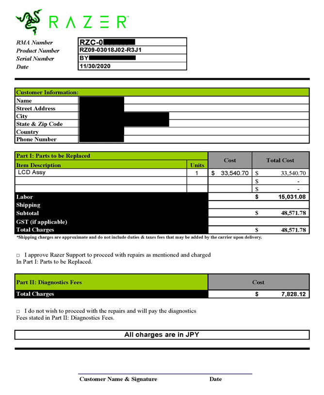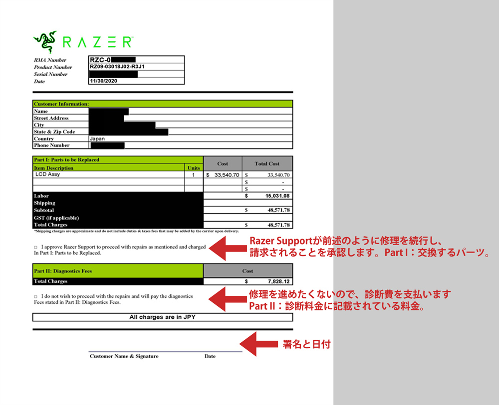 以下をお読みになり、ご理解と同意の両方を示して返信してください ・プライバシーを保護するために、Razer修理センターは修理のために分析する前に製品を工場出荷時のデフォルトにリセットします。これにより、すべての個人データ、ソフトウェア、およびプログラムが削除されます。 ・Razer認定修理センターにサービスを依頼する前に、製品上のすべてのデータ、ソフトウェア、およびプログラムを完全にバックアップするのはユーザーの責任です。 ・いかなる状況においても、Razerはデータ、ソフトウェア、またはプログラムの損失について責任を負いません。 ・製品の限定保証による。該当するシステムアップデートを除き、製品は最初に購入したときに構成されたとおりに返送されます。他のすべてのデータ、ソフトウェア、およびプログラムを再インストールする責任はお客様にあります。 ・Razerは、Razer修理センターに発送された身の回り品の紛失または破損については責任を負いません。製品を出荷する前に、SSDとRAM、アダプター、ケーブル、メモリーカード、およびキャリングケースに対するサードパーティのアップグレードをすべて削除してください。商品を最初に購入したときに箱に入っていた商品のみを発送してください。 ・Razerは、16歳未満の子供から故意に情報を収集または使用することはありません。16歳未満の場合、保証または修理サービスを処理するには、大人に連絡する必要があります。 ・お住まいの地域によっては、不良品の修理への発送方法をご案内します。 ・Razerは、すべての製品が修理できることを保証するものではありません。製品が修理できない状況があるかもしれません。 製品がRAZERREPAIRCENTERに到着した後 ・製品が納品されてから2〜3営業日以内に、Razerが故障の原因を診断します。 ・Razerは製品の問題の再現を試みます。不可能な場合は、Razerカスタマーケアから障害に関する追加情報について連絡があります。問題を再現できない場合、Razerは製品を返品する前に再度連絡します。 ・外観上の物理的損傷が見つかった場合、オプションの修理の見積もりがメールで送信されます。 ・Razerが故障の原因を特定し、部品と作業の修理見積もりをメールで送信します。 ・見積もり日から30日以内に支払いがない場合、または修理を拒否した場合、Razerは未修理の製品を最後に指定した住所に発送します。 ・見積もりを承認すると、RazerからPayPal経由で請求書がメールで送信されます。 ・請求書の支払い後、Razerは3〜5営業日以内に修理を完了します。 ・Razerが修理を完了し、製品は完全にストレステストされてお客様に返送されます。修理された製品は、元の保証の残りの期間または納品から90日以内に保証されます。 ・Razerから、追跡番号を記載した修理品の発送確認メールが届きます。 「承認します」と返信することにより、上記の条件を理解して同意し、Razerおよび/またはその関連会社は、いかなる状況においても、データ、ソフトウェア、および/またはプログラムの損失または破損について責任を負わないことを認めるものとします。あなたの製品。 |