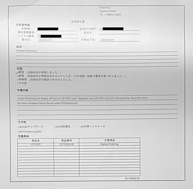 【翻訳】作業内容:LCD ASSYの問題により、画面がちらつき、表示が消える-新しいLCD ASSYを交換し、LCDを調整してから、リカバリを実行しましたFQC /エージングテストで他のハードウェア障害は見つかりませんでした。→これもよく分かんないけど直ってたし〇