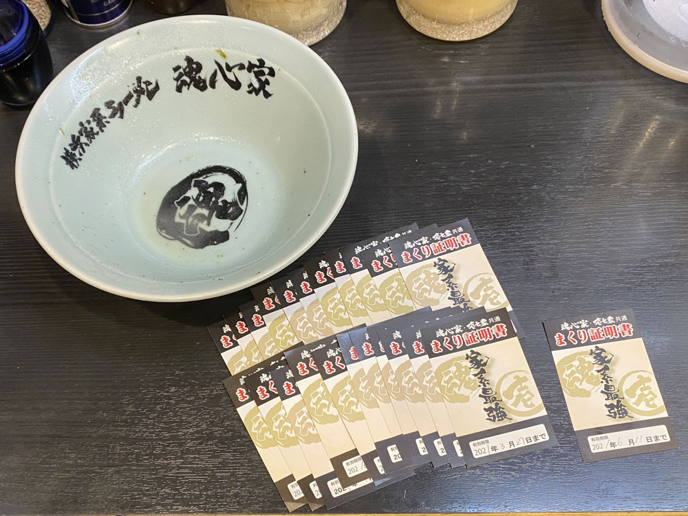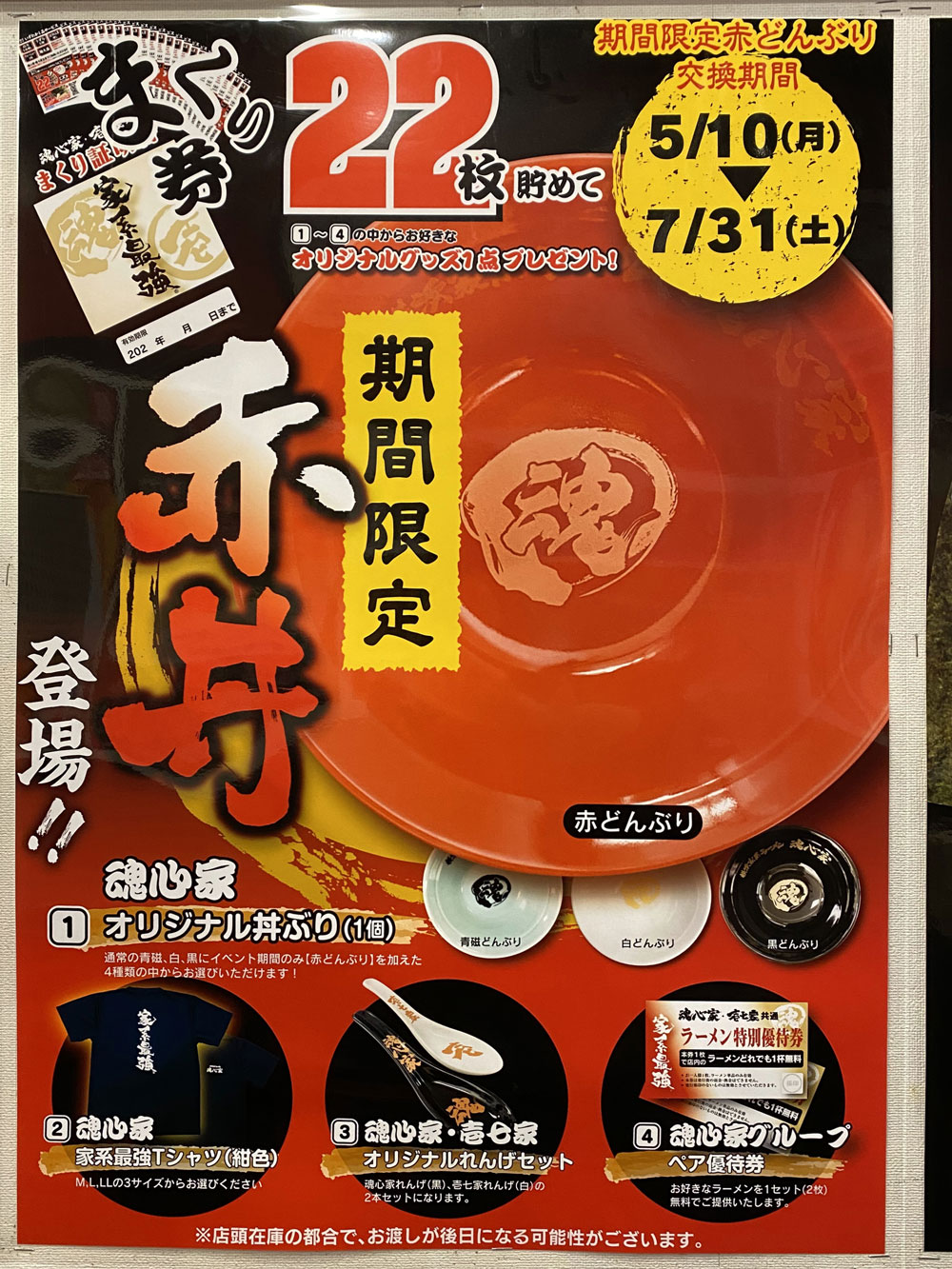 横浜家系ラーメンの魂心家にてスープを飲み干すと貰える「まくり証明書」とういうサービス券を22枚集めるともらえるオリジナルグッズに2021年5月21日~7月31日の期間限定で「魂心家オリジナル・赤丼」が登場したので早速入手しました!
